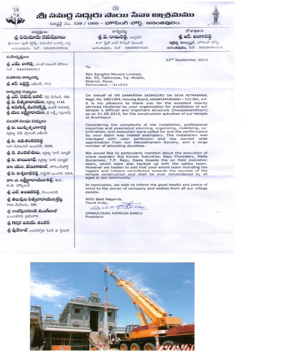 - On 1st September, 2013, we have done the erection of 1 No. Dwajasthambam, an important structure weighing around 15 MT & 33 feet in length for Sri Samartha Sadhguru Sai Seva Astramam, one of the temple situated in Anantapur, Andhra Pradesh. We have provided our 100 MT Capacity Crane for this erection free of cost, pursuant to our Social Responsibility for this religious cause. (Click here)