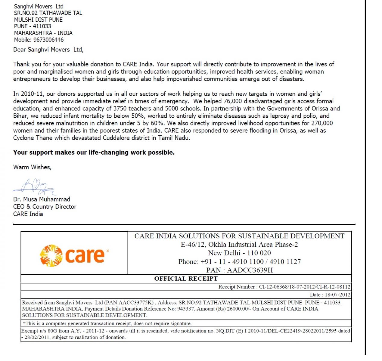 - Company has denoted Rs. 26000/- towards the financial support pursuant to an appeal made by CARE INDIA. (Click here)