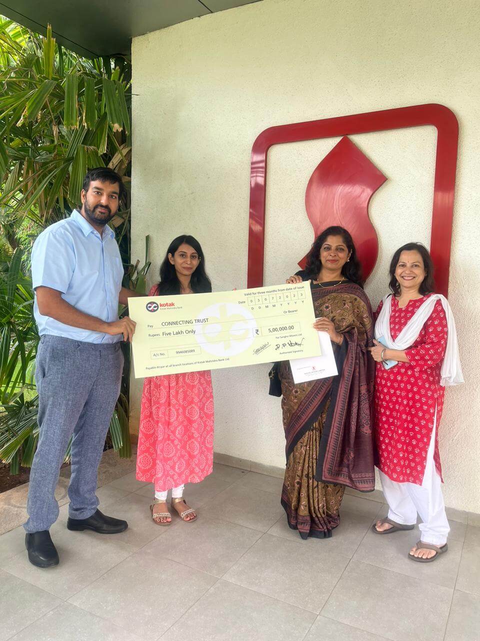 - Mr. Rishi C. Sanghvi – Managing Director handing over cheque to Ms. Sukhada Khisti – CEO & Ms. Shilpa Tambe – Coordinator – Connecting Trust. Paid donation of Rs. 5,00,000/-
