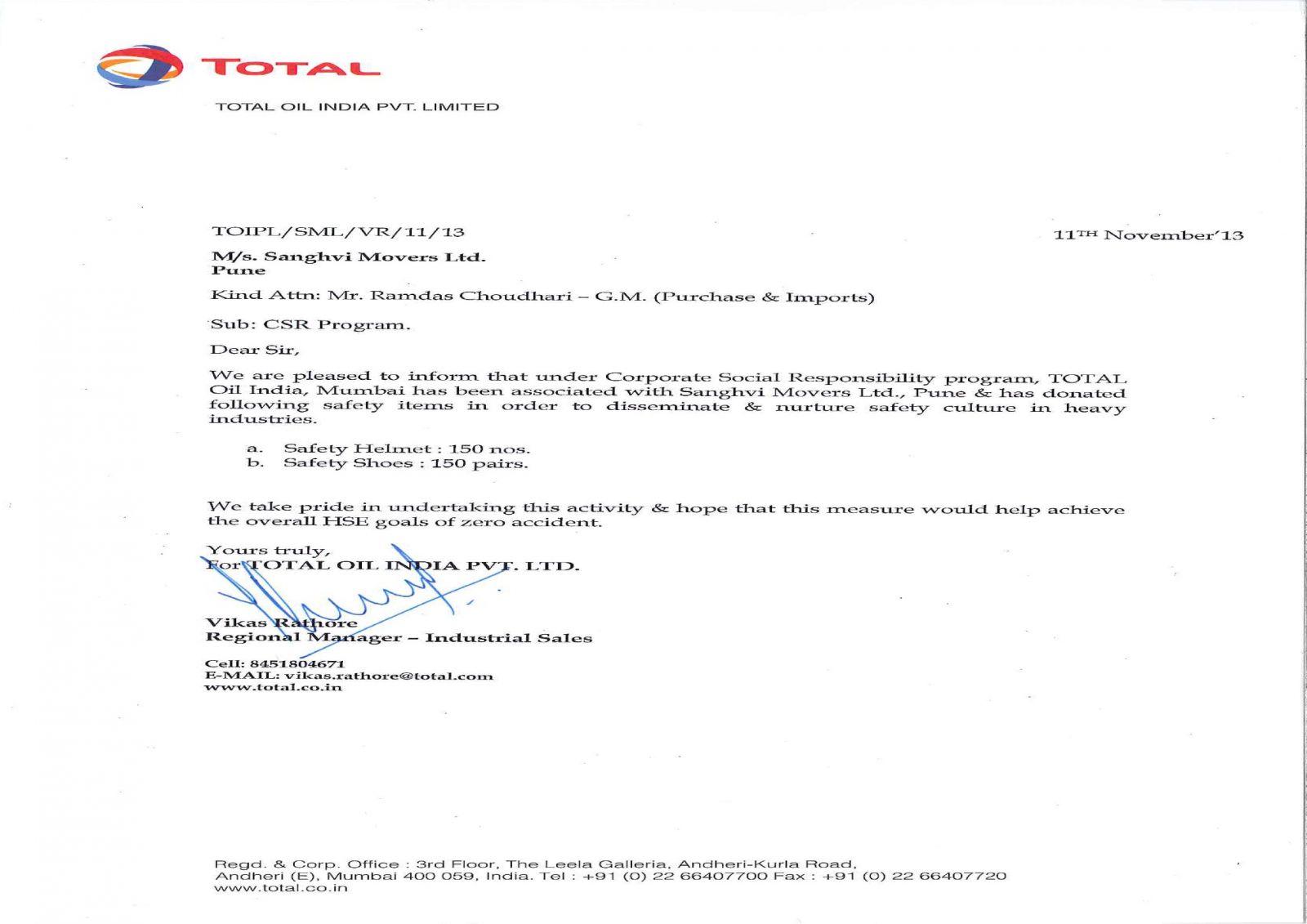 - In association with Total Oil India Private Limited SML has donated 150 safety helmets and shoes to its workers in its main workshop in Sate, Pune in the month of October, 2013.(Click here)