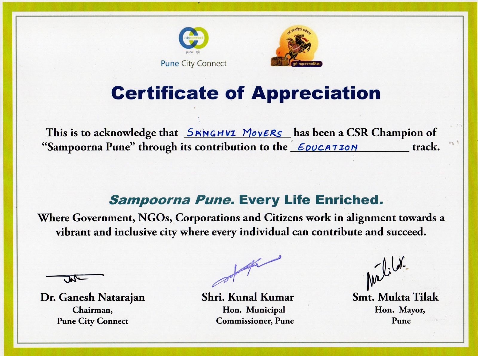 - Pune City Connect (PCC) had organized a conference “Sampoorna Pune: Every Life Enriched!” To significantly improve the quality of learning in municipal schools in Pune, the Education track comprises of two strategic projects with the Pune Municipal Corporation (a) Sahyogi Dal Project; (b) School Improvement Project. Sanghvi Movers Limited is supporting Pune City Connect for School Improvement Project.(Click here)